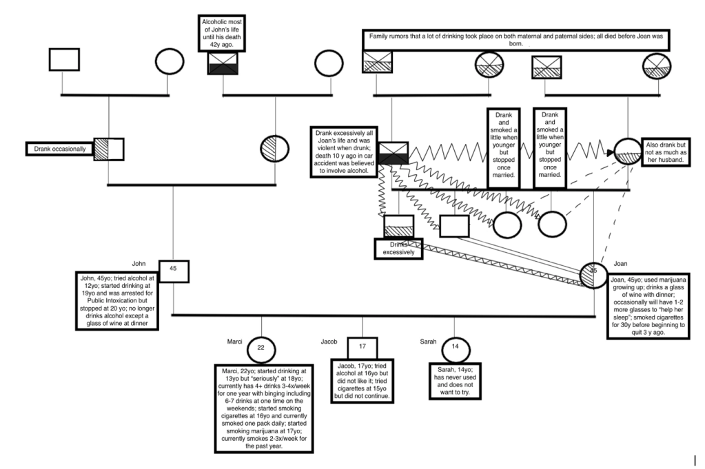 - Review of the family genogram. Reviewing this genogram has the potential to open Marci’s eyes to the issues being passed down throughout her family, especially along with learning about the 50-60% of heritability of Alcohol Use Disorders and its ties to anxiety (Pandey et al., 2017).