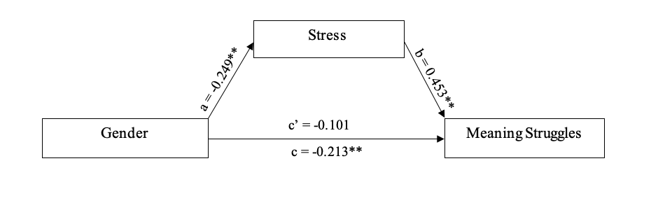 Alternatively, it is possible that the relationship between gender and meaning struggles may have something to do with different gender’s relationship with stress; therefore, stress may be the mechanism by which gender exerts its influence on meaning of life struggles.