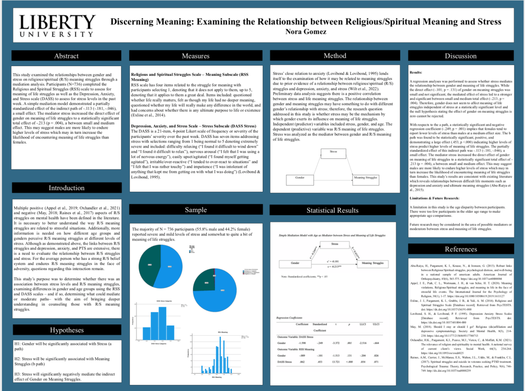 Stress’ close relation to anxiety (Lovibond & Lovibond, 1995) lends itself to the examination of how it may be related to meaning struggles due to prior evidence of a relationship between religious/spiritual (R/S) struggles and depression, anxiety, and stress (Wilt et al., 2022). Preliminary data analysis suggests there is a positive correlation between stress and life meaning struggles. The relationship between stress and meaning struggles may have something to do with stress’s relationship with age; therefore, it is hypothesized that age may be the mechanism by which stress exerts in influence on meaning of life struggles.
